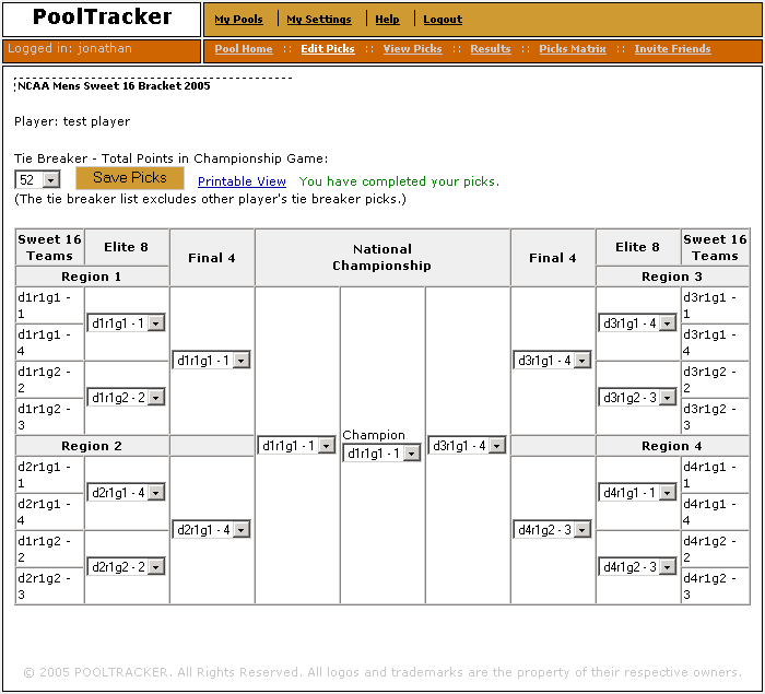 Similar to our classic style march madness bracket pool, but, for the sweet 16. All 15 picks to all remaining 15 games must be made before the tip-off of the first game in the round of 16.
