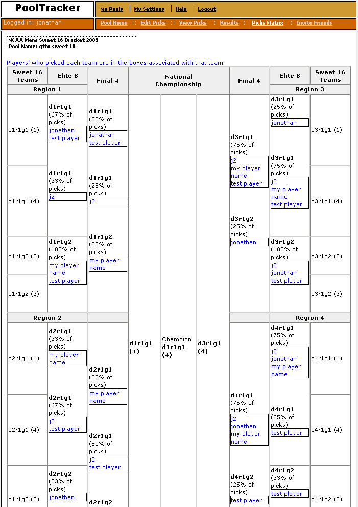 Allows the pool administrator to see everyone's progress in enterring their picks. Administrators can activate, inactivate and delete players and edit players' picks.